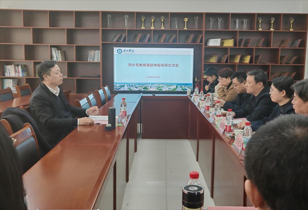 在随后的国家级课题申报专项指导会上,李甲亮对周长军院长来校指导工作表示欢迎,对山东大学多年来给予德州学院的帮助支持表示感谢。李甲亮还介绍了学校学科建设、人才培养、科学研究等方面的情况。周长军对法学与公共管理学院教师国家级课题的申报书逐一进行点评,并提出中肯的意见及修改建议。