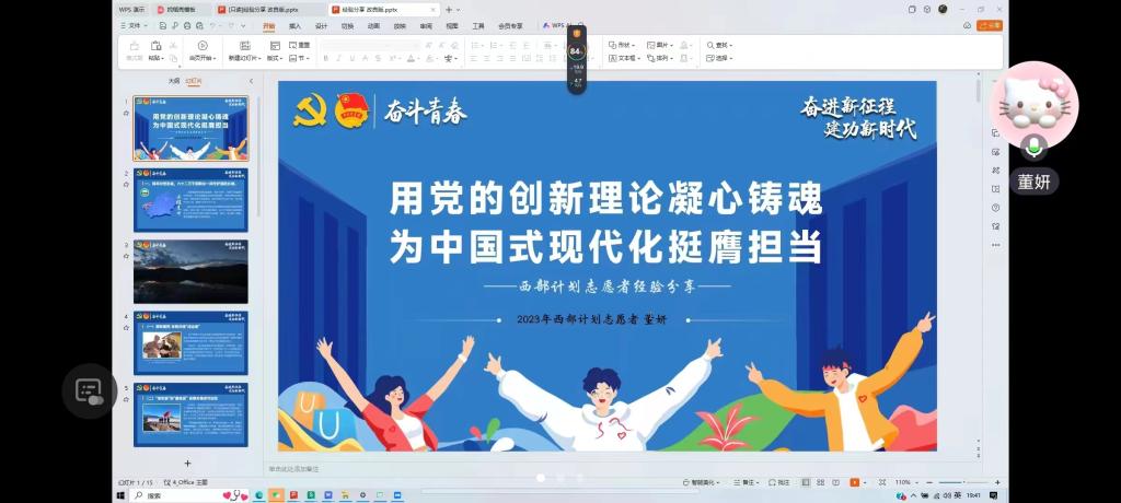 本次会议邀请了6名我院近三年西部计划志愿者代表,通过线上分享的方式,介绍了西部计划的报名流程、服务内容、选拔标准等相关信息,并讲述了自己参加西部计划的工作经历,同时向参会同学们分享了服务期间的工作感悟。随后,同学们与学长学姐进行交流互动,志愿者们针对同学们提出的问题,结合自身工作经验进行一一排疑解惑。最后,西部计划志愿者们鼓励和动员同学们积极投身西部建设,为西部地区发展贡献自己的青春力量。