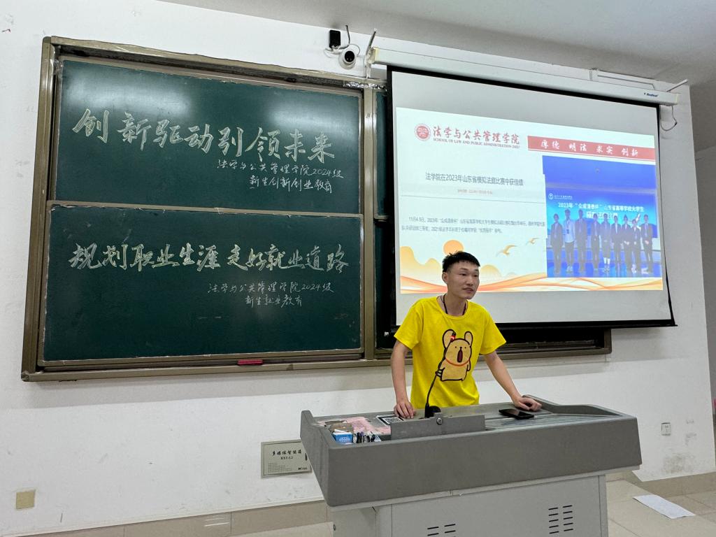 讲座中,学院创新创业工作负责人耿雯老师向2024级新生们解读《德州学院大学生科技文化竞赛管理办法》、《德州学院大学生科技文化竞赛目录》及激励政策,并介绍了法学与公共管理学院以课程为抓手,以活动为基础,以项目为核心的创新创业教育体系,随后展示了院系近两年参赛获奖情况,鼓励新生增强自信、提升自我、努力创新、共创青春。