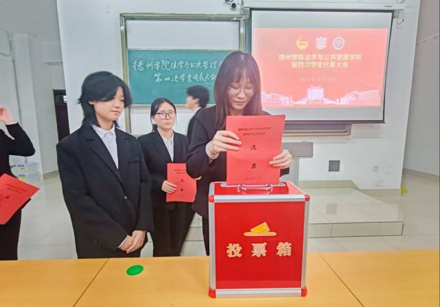 大会第四项,经过全体学生代表无记名投票,选举产生了德州学院法学与公共管理学院学生会主席团成员和出席学校学代会代表。
