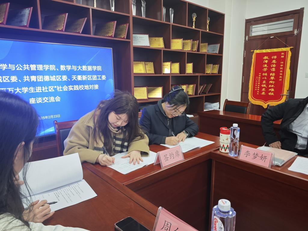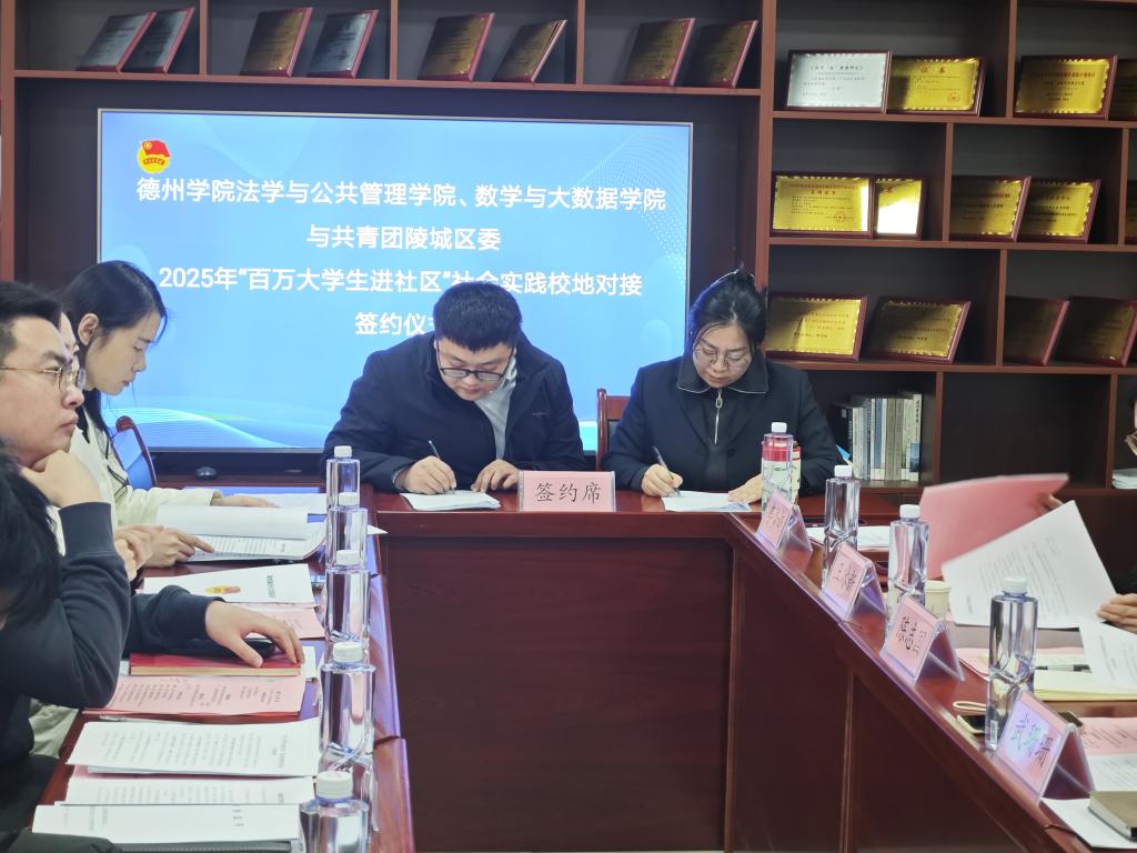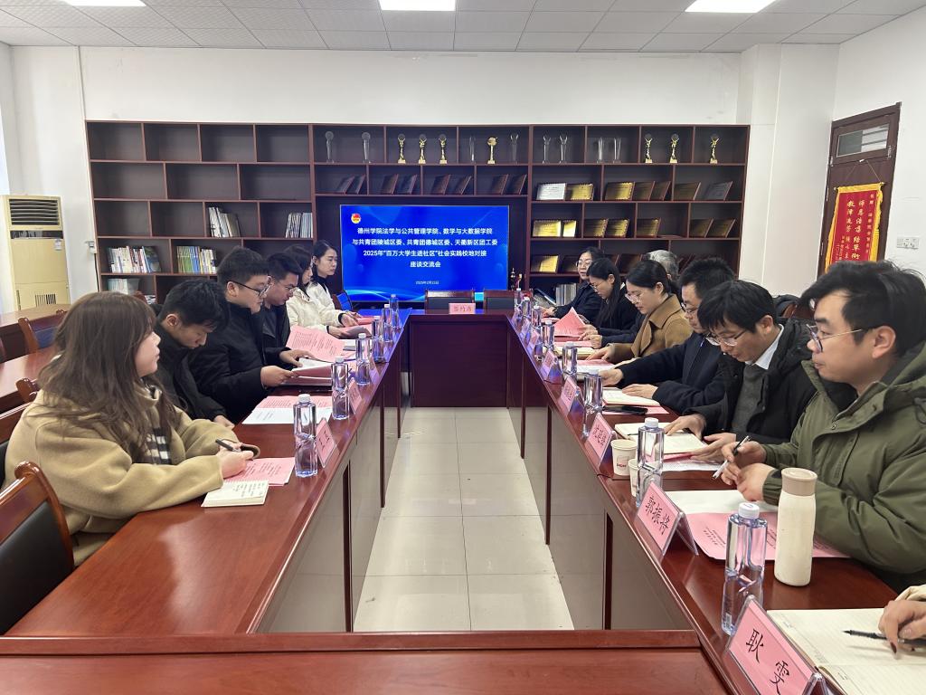 为推动城校融合提质增效,提升人才培养质量,拓宽大学生实践渠道。2025年2月23日,法学与公共管理学院与共青团陵城区委、共青团德城区委、天衢新区团工委举行2025年“百万大学生进社区”社会实践对接活动。会议对“百万大学生进社区”社会实践工作进行了安排部署,明确了社会实践结对共建的八方面重点任务清单。
