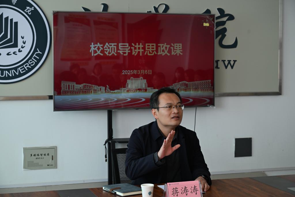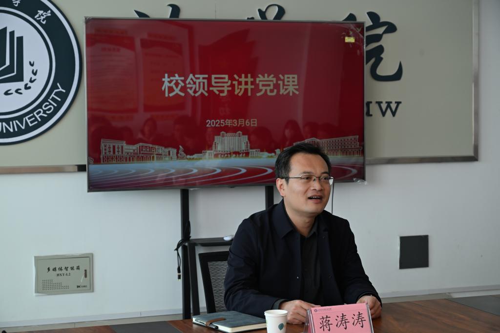 2025年3月6日,校党委委员、副校长蒋涛涛到法学与公共管理学院开展讲党课、讲思政课活动,我院学生党员、部分学生干部代表参加活动。蒋校长以“安全筑基、就业领航、目标铸魂”为主线,为学生们带来一堂有高度、有温度、有力度的授课。