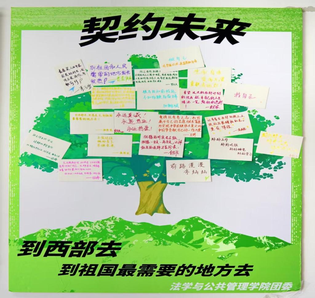 随后,志愿者们依次发言,分享报名初心与心路历程。志愿者们表示,期待在西部的广袤天地中直面挑战、收获成长,以实际行动回报学院培养,践行青年担当。并纷纷拿起笔,在明信片上书写对自己服务西部的期望,将专业知识和理想信念融入文字,并将其贴在“契约未来”展板上。
