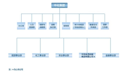 中化集团设立能源、化工、农业、地产和金融五大事业部,对境内外300多家经营机构进行专业化运营,并控股“中化国际”(SH, 600500)“中化化肥”(HK, 00297)“中国金茂”(HK, 00817)等多家上市公司,拥有全球员工近六万人。