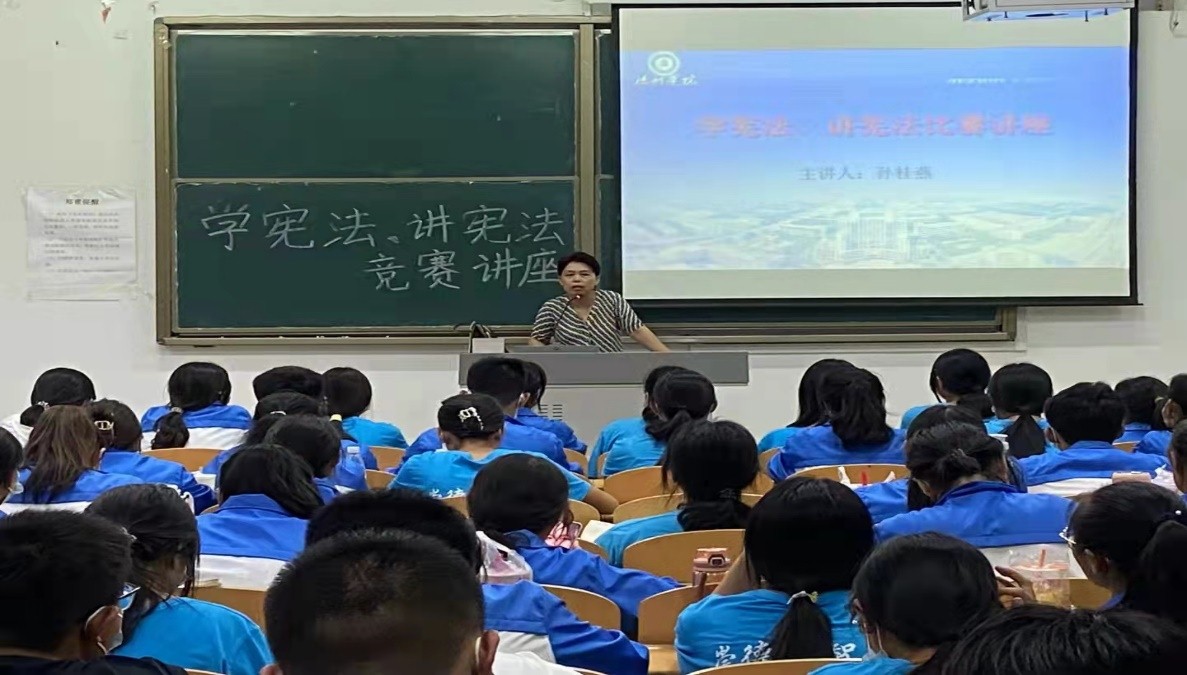 孙桂燕老师主要从赛事介绍、举办赛事的目的、山东省赛区选拔赛情况、获奖情况和2021年的参赛准备情况等五个方面对“学宪法、讲宪法”比赛进行了详细的讲述,并鼓励同学们精心准备、积极参与,激发了同学们的参与意识。