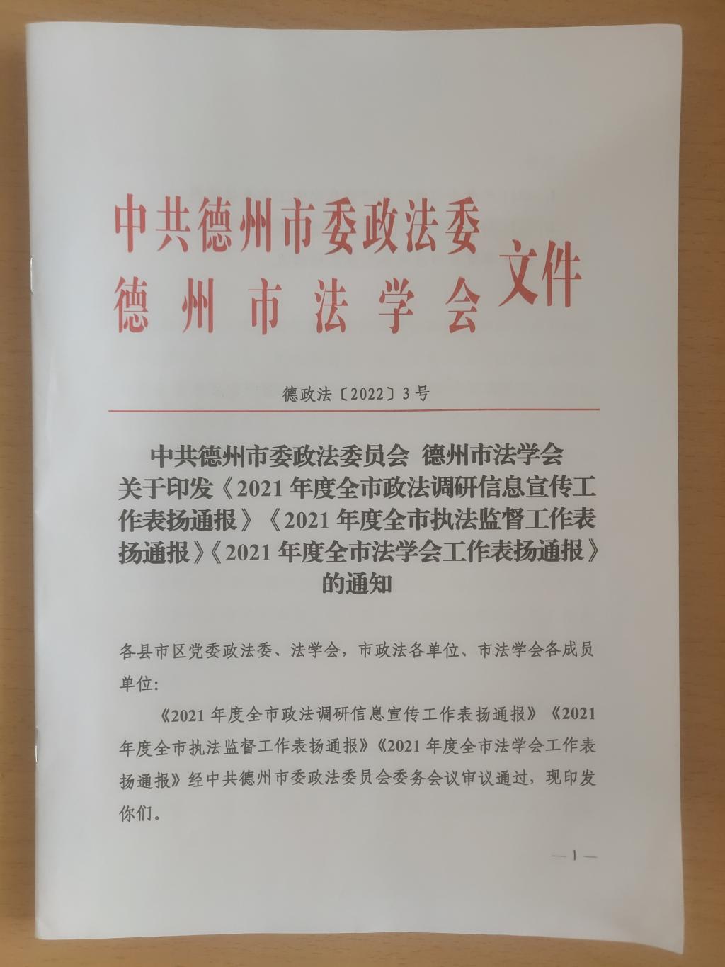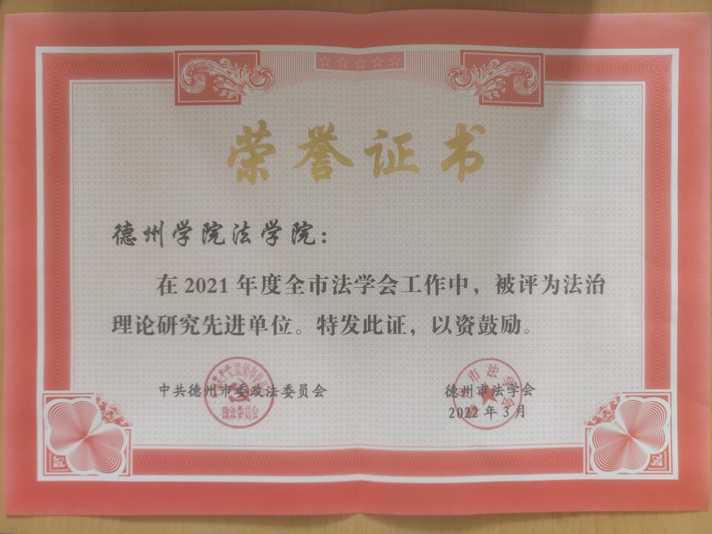 2022年3月2日,中共德州市委政法委、德州市法学会发布了《2021年度全市法学会工作表扬通报》,德州学院范冰冰高潮一区二区三区被评为“2021年度全市法治理论研究先进单位”,徐丽红副教授被评为“2021年度市法学会会员单位先进个人”。