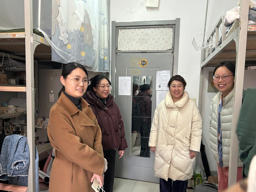 检查小组深入学生宿舍,逐层逐间对宿舍卫生、用电安全、消防设施等方面进行了细致检查。重点排查了违规电器使用、插线板摆放、门窗牢固性等问题,并对宿舍内吸烟、垃圾清理不及时等不良现象提出了整改意见。大部分宿舍表现良好,卫生整洁、物品摆放有序,展现了良好的宿舍风貌。在检查过程中,学院领导与辅导员老师们不仅指出了存在的问题,还与学生们进行了亲切交流,叮嘱大家注意消防安全,杜绝侥幸心理,做到人走断电、人走落锁,保管好贵重物品,增强反诈意识。在走访过程中,学院领导老师与毕业生们进行亲切交流,详细询问了学生的考研情况、就业意向及求职过程中遇到的困难,并鼓励他们积极关注招聘信息,提升求职技巧,树立理性的择业观。