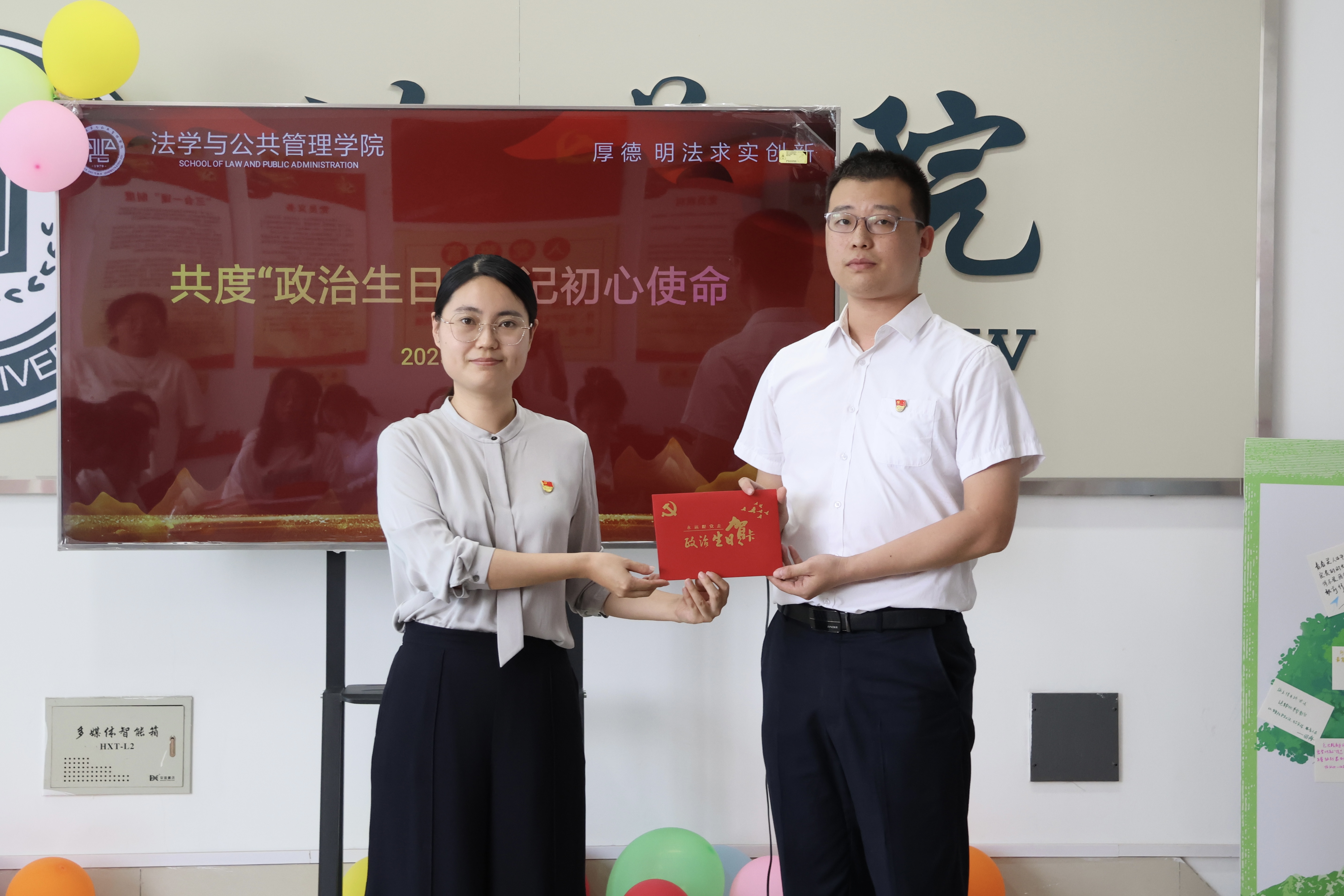 在温馨庄重的“政治生日”环节,学院为6月份入党的毕业生党员送上精心准备的“政治生日”贺卡,上面印有入党誓词、入党时间以及党组织的殷切期望。随后,全体与会党员面向党旗,庄严重温入党誓词,誓言铿锵,彰显出对党的忠诚以及为共产主义事业奋斗的决心。