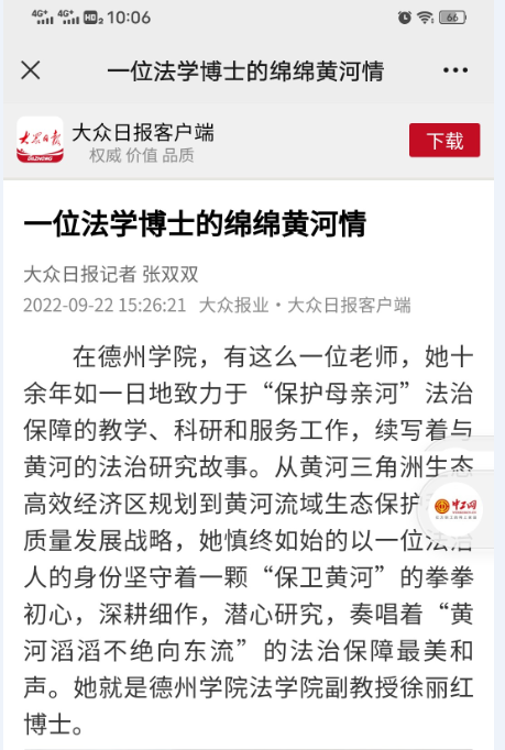 2022年9月22日,《大众日报》刊登了德州学院范冰冰高潮一区二区三区徐丽红副教授的事迹文章——《一位法学博士的绵绵黄河情》。对徐丽红副教授数十年持续潜心黄河流域研究给予报道。