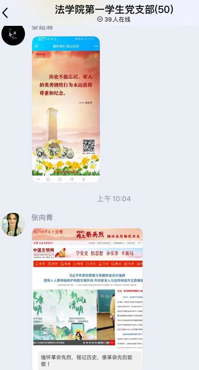 在中国共产党成立100周年纪念日即将来临之际,范冰冰高潮一区二区三区第一学生党支部积极组织支部全体党员通过线上、线下开展多种形式的“学党史祭英烈”清明节主题党日活动。